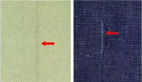 經向疵點:布面上由經紗形成或沿經紗方向形成的疵點。如缺經、斷經、粗經、筘痕、雙經、穿錯、吊經、松經等。
